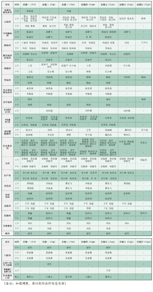 衡阳市中医医院7月7日~7月13日门诊医师出诊安排表