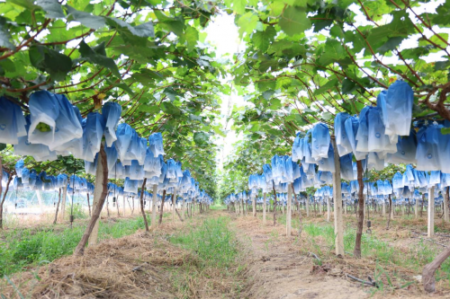 据基地负责人介绍,葡萄园采用大棚避雨栽培及套袋保护的模式,得益于良好的气候条件和精心管护,今年基地的葡萄长势喜人,采摘期预计可持续至十月份。