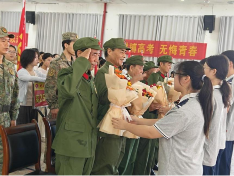 此次大会特别邀请了退伍老兵为同学们上了一堂生动的国防教育和爱国主义教育课。宣讲结束,五位老兵进行了精彩的队列展示,挺拔的军姿、刚劲有力的动作,赢得全场雷鸣般的掌声。随后,学生向五位老兵献上鲜花,表达崇高的敬意。