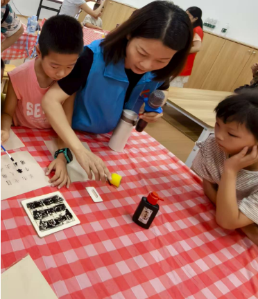 活字印刷术工坊里,手工老师先细致讲解这项非遗技艺的历史与原理,再手把手指导操作。孩子们分组协作,小心翼翼地排列“日”“山”“水”等蕴含自然意象的古字体,将油墨均匀滚涂后,在宣纸上印出一幅幅带着墨香的作品。作品完成后,老师邀请所有孩子举起作品拍照展示,一张张笑脸与墨香作品相映成趣,进一步激发了大家的创作热情,让传统文化与生态理念在指尖悄然融合。