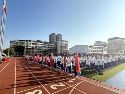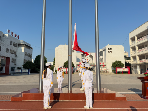 雄壮的国歌声回荡在校园上空,全体师生肃然起立,向迎风飘扬的五星红旗行注目礼,熠熠生辉的国旗迎着朝阳冉冉升起,昭示着新学年的征程与梦想。