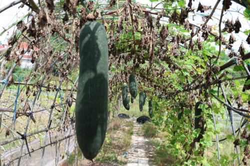 走进种植基地,只见翠绿的藤蔓间,一个个墨绿冬瓜油亮光滑,像裹着墨绿色铠甲,体型适中;新品种巨型冬瓜更是引人注目,体型巨大,单瓜重量普遍有100斤,最大的能达到180斤,长1.8米。