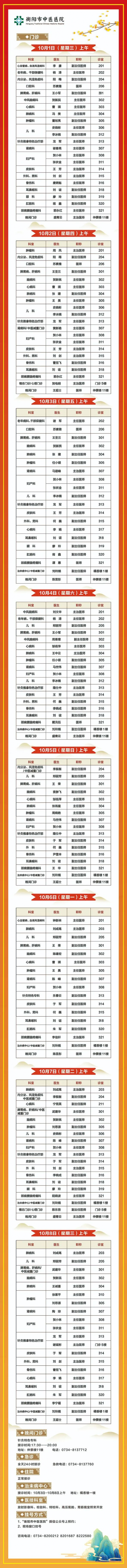 为满足广大市民假期就诊需求,衡阳市中医医院积极推行“无假日医院”。现将国庆和中秋假期诊疗服务安排如下: