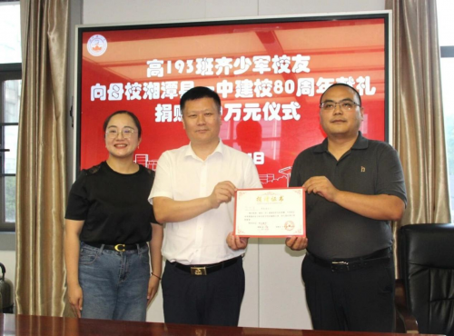 湖南普航环保节能科技有限公司董事长、高 193 班校友齐少军,怀着对母校的深厚眷恋与感恩之情,现场捐赠 100 万元。这笔资金将为学校的教育教学设施提升、师资队伍建设等方面提供有力支持。仪式上,唐乐军校长满含感激,向齐少军校友颁发捐赠牌与证书,对其回馈母校的善举予以高度赞扬。齐少军校友感慨道:“母校的培育之恩难以忘怀,希望这份捐赠能为学弟学妹们创造更好的学习条件,助力母校教育事业更进一步。”