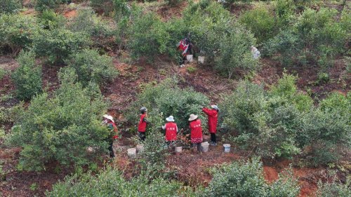在衡山县开云镇山竹村的油茶种植基地,满山的油茶树郁郁葱葱,随着山势蜿蜒铺展,一颗颗圆润饱满的油茶鲜果坠满枝头。几十名采摘工人穿梭在油茶林间,动作麻利地忙着采摘、装袋、搬运,现场一派丰收景象。