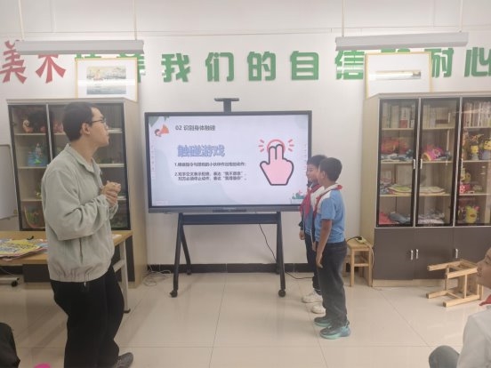 活动以安全守护话题开篇,主持人暖声提问:“有陌生人碰肩让你不适怎么办?”,巧妙避开敏感表述,悄然拉近与孩子们的距离。随后,主持人播放家人温馨拥抱的卡通图片,自然引出爱护身体的主题。在认识身体与安全接触环节,主持人结合动画《身体的小秘密》与PPT,用“泳衣覆盖的部位就是隐私部位”来讲解,让学生快速直观的有了初步认知。互动模拟环节,主持人邀请两位学生上台演示:先明确“安全动作举手示意、不安全动作双手交叉拒绝”的规则,随后依次给出握握手、拍拍肩的安全指令,学生立刻举手确认;再给出“我想碰你的屁股”的不安全指令,学生立刻双手交叉表达拒绝。模拟结束后,主持人结合场景提炼出“拒绝、离开、告知”自我保护三步法,帮助学生直观理解安全边界,有效强化了学生的自我保护意识。随后的知识问答围绕PPT所学展开,既巩固安全知识,更引导孩子明辨是非,厚植互助友爱的道德情怀。最后,学生们在指导下,认真填写父母等2位信任者的联系方式,用彩笔绘出星星、小太阳等安全标记。学生登台分享卡片,诉说“最想告诉的人”,在互动中传递勇敢自护的理念,让思想道德阵地的教育成果落地生根。