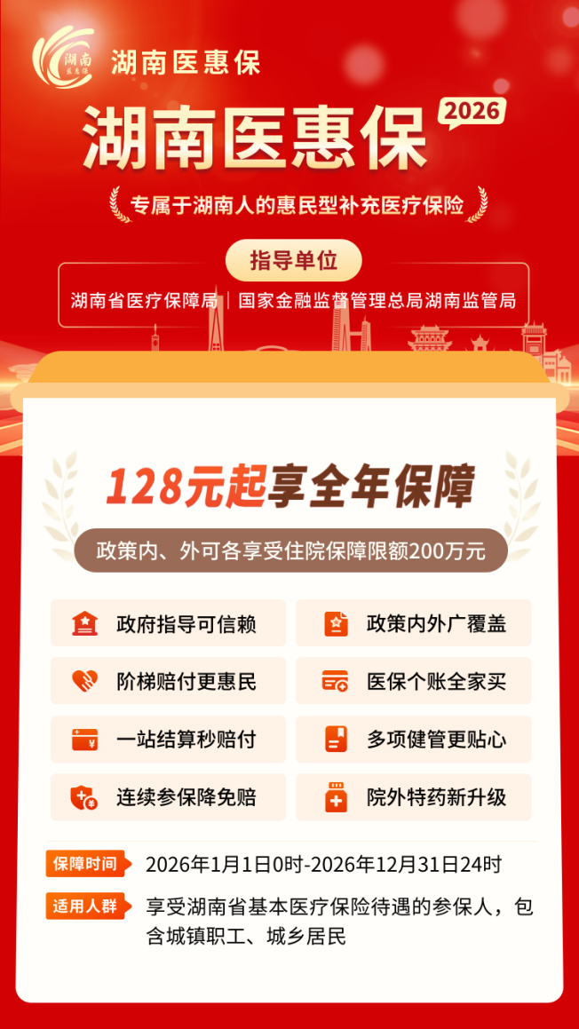 湖南人请注意啦!由政府指导“湖南医惠保2026”正在火热参保中,12月底截止,请您不要错过参保缴费!