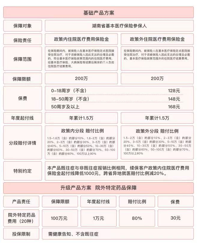 “湖南医惠保2026”与基本医保、大病保险有效衔接,是构建湖南省多层次医疗保障体系的重要组成部分之一。产品128元起保一年,平均每天不到5毛钱,不仅医保政策内、外的住院医疗费用都能按产品保障规定补充报销,还能附加勾选20种特定药品保障!让看病更有底气,不怕高额自费药!而且一人操作,就能为配偶、子女、父母、近亲属同时投保,还能直接使用医保个人账户余额支付,不占用现金,连续参保还有优惠,具体保障方案如下: