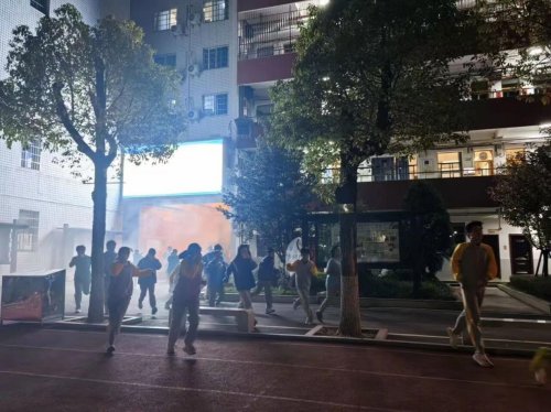 当晚7时10分,校园内火灾警报声突然响起,演练正式启动。全体寄宿生迅速响应,严格按照演练规范行动:以湿毛巾捂住口鼻,保持弯腰低姿,在宿管老师与值班老师的全程引导下,沿预定疏散路线快速向操场安全区域撤离。最终,全体寄宿生仅用 1 分 50 秒 62 便全部安全抵达指定集合点,演练达到预期目标。