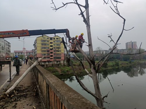 当天,镇政府安排十余名专业人员组成作业队伍,调配吊车、铲车等大型设备赶赴现场。工作人员先在周边设置安全警示标识,疏散围观群众和过往车辆,划定作业安全区域。随后,施工人员利用吊车固定树干,采用分段锯切的方式,从树冠至树干逐步拆解枯死树木,避免枝干坠落造成二次伤害。对于掉入白河中的枯树残枝,施工队伍同步开展清理作业,确保河道畅通。整个处置过程规范有序,仅用半天时间便完成了两株枯树的锯除、清运及现场清理工作。