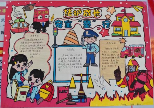 活动根据学生年龄特点分层展开:一、二年级同学制作主题剪贴报。他们在老师和家长的帮助下,从报刊画册中挑选与交通、防溺水、防欺凌等相关的图文,巧手拼贴出色彩斑斓、童趣盎然的作品,展现了低年级学生对安全知识的初步理解。