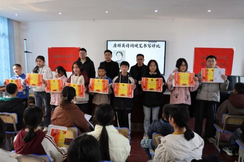 活动最后,学校举行唐群英诗词硬笔书写比赛颁奖仪式。此前,学校面向全体学生发起征稿,同学们挥毫泼墨,将对革命先驱的敬仰之情融入笔端。一幅幅气韵生动的书写作品,尽显少年意气与文化底蕴。校领导为获奖学生颁发奖状与奖品,号召师生在翰墨飘香中感悟传统文化魅力,传承群英精神风骨。