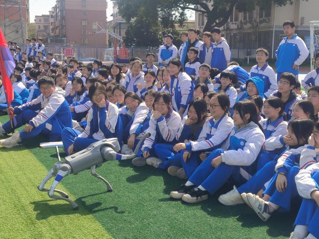 机器狗成为现场“团宠”,在掌声中走到学生面前,接连表演后翻、握手、挥手,憨萌模样让大家忍不住欢呼叫好,老师还同步讲解了机器狗在日常、消防等领域的实用本领。