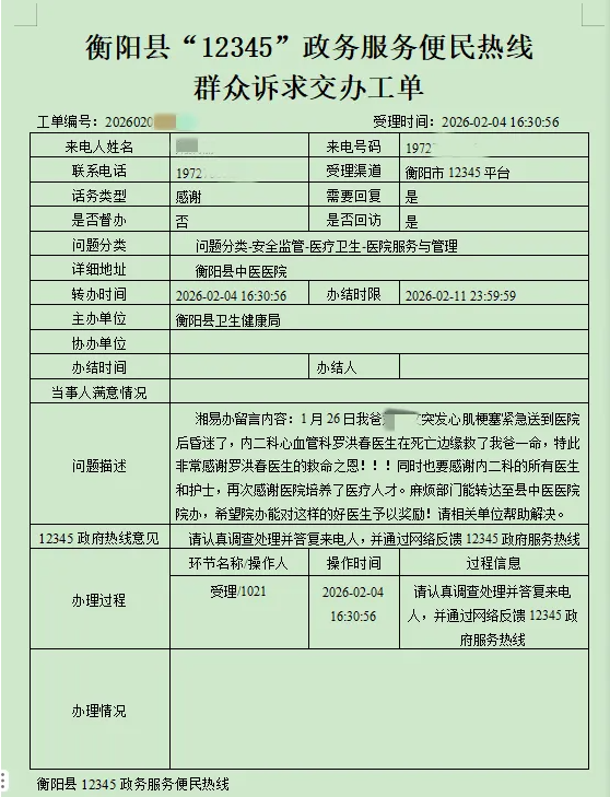 近日,一封衡阳县"12345"政务服务便民热线的群众实名表扬工单,让衡阳县中医医院心血管内科的医护团队受到广泛关注。工单中,患者家属以质朴的语言点赞罗洪春医生及团队的"救死扶伤、仁心仁术"。这份沉甸甸的认可,源于1月26日那场惊心动魄的生死竞速。