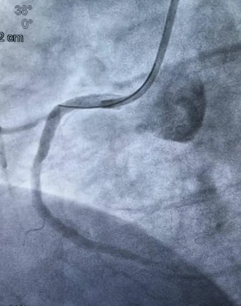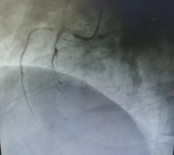 ?复查心电图明确诊断为急性下壁心肌梗死,病情极其凶险。冠脉造影结果显示:冠脉三支严重病变,其中右冠状动脉中段急性完全闭塞,伴大量血栓影,合并右冠自发性夹层,属于极高危复杂病变,随时可能再次发生恶性心律失常、心源性休克甚至猝死。
