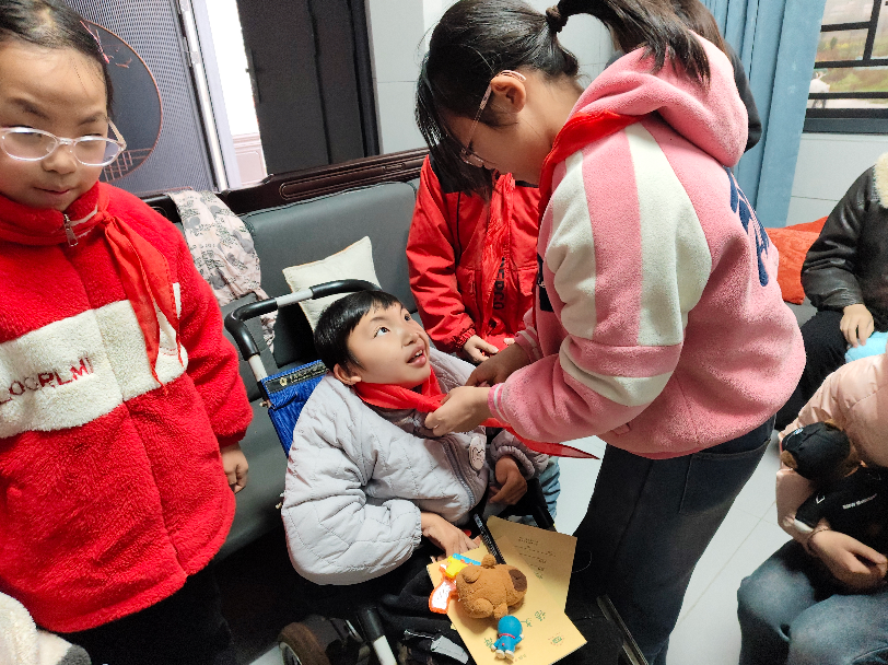 伴随着欢声笑语,师生志愿者们来到孩子家中。没有过多言语,同学们便热情地迎上前,轻轻将玩具、文具和绘本递到对方手中。在温馨静谧的氛围中,少先队员代表郑重地为孩子系上一条崭新的红领巾。随着红领巾在胸前迎风飘扬,孩子眼中瞬间闪烁出惊喜与自豪的光芒。这不仅是身份的象征,更是少先队组织对孩子的深情接纳,让孩子深切感受到了来自学校大家庭的温暖与力量。