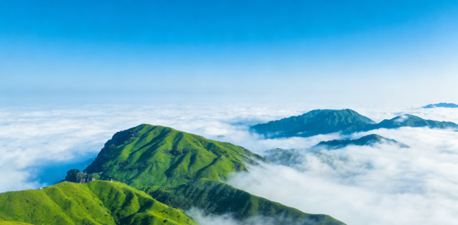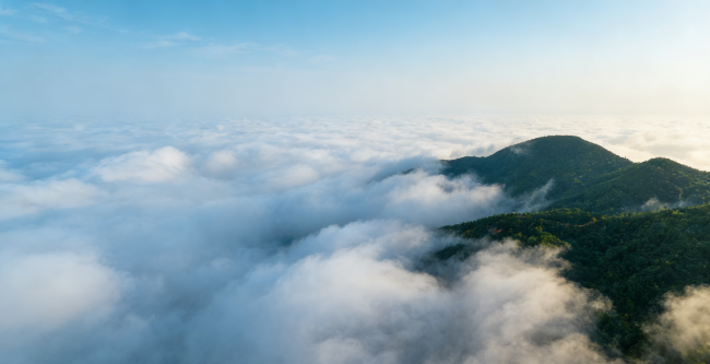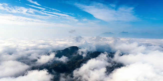 无人机飞在高空远眺,万顷白云如浪潮奔涌,将连绵群山轻轻托举。黛色峰尖刺破云层,似海中孤岛,又似水墨画里的留白意境;远处的城郭与山峦在薄雾中若隐若现,与澄澈蓝天相映,晕染出一幅流动的山水长卷。风过时,云浪翻涌,光影流转间,平日里熟悉的衡山,便成了与世隔绝的缥缈仙境。
