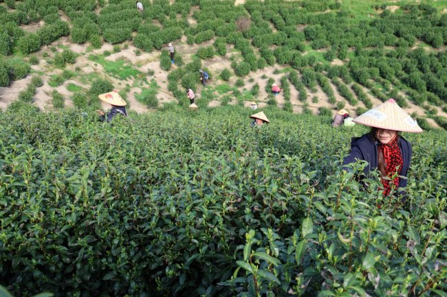 (茶农们穿梭茶垄间采茶 吴霞摄)