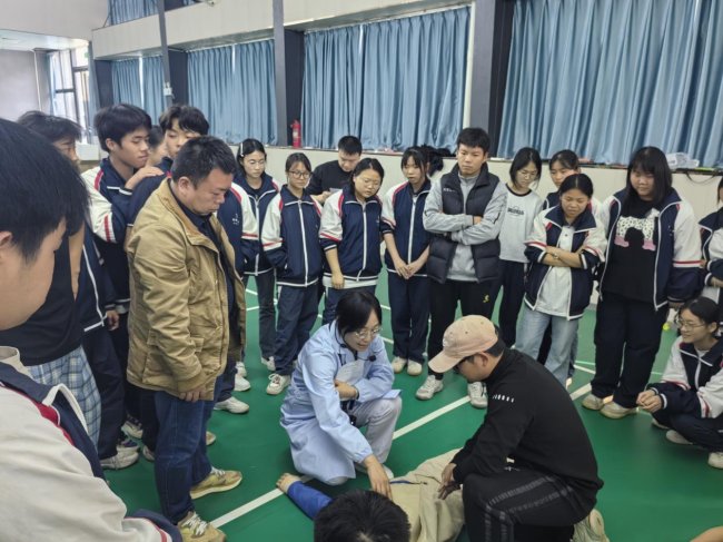 在实操演练环节,医护人员利用专业模拟人,手把手指导师生进行心肺复苏实操练习。师生们分组上阵,亲身实践急救操作;专家全程耐心纠正不规范动作,逐一解答师生提出的各类急救疑问,切实提升师生的应急处置能力。